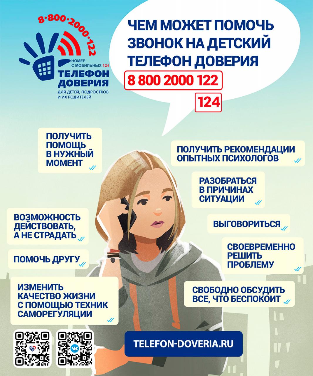 Детский телефон доверия02.02.2026 В Московской области работает детский телефон доверия, где дети и родители могут оперативно получить консультацию психолога. Получить поддержку психологов детского телефона доверия стало еще проще.Номер 8 (800) 2000-122, по-прежнему, доступен с любого стационарного или мобильного телефона, но теперь к нему добавился новый — 124. Звонить на него могут абоненты всех операторов мобильной связи абсолютно бесплатно. |