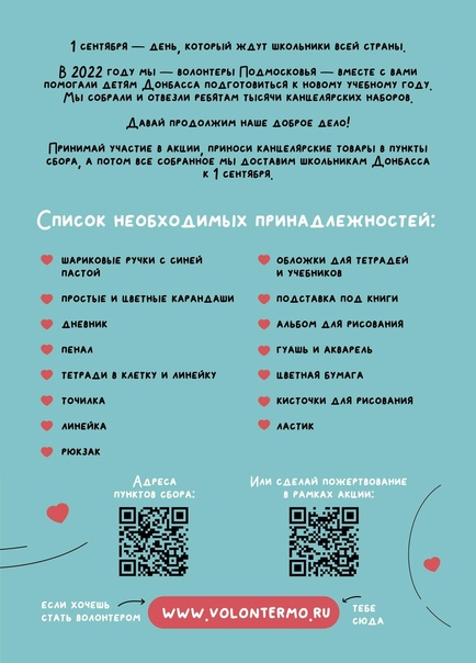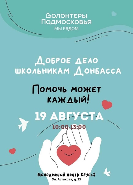 19 августа с 10:00 до 13:00 все желающие могут принести детские книги отечественных авторов и канцелярские товары: шариковые ручки с синей пастой, простые и цветные карандаши, дневники, пеналы, тетради в клетку и линейку, точилки, линейки, ластики, обложки для тетрадей и учебников, подставки для книг, альбомы для рисования, гуашь и акварель, цветная бумага, кисточки для рисования, рюкзаки и другие товары для школьников в Молодежный центр «Русь» по адресу: